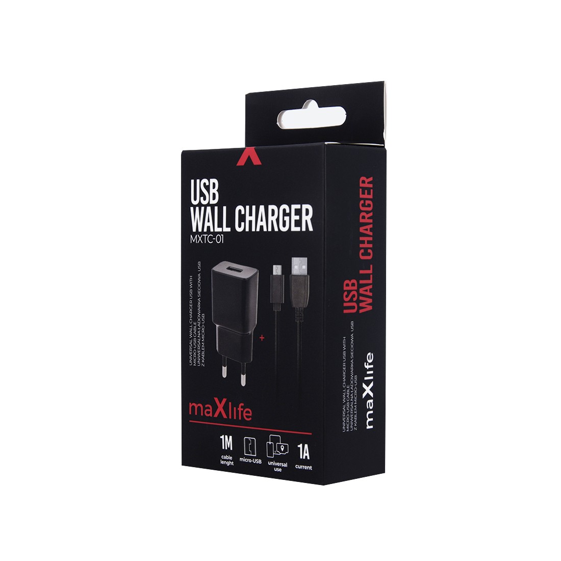 Caricabatterie da rete universale presa spina Maxlife USB + cavo MICRO USB 1A 5v cavo 1 metro Nero