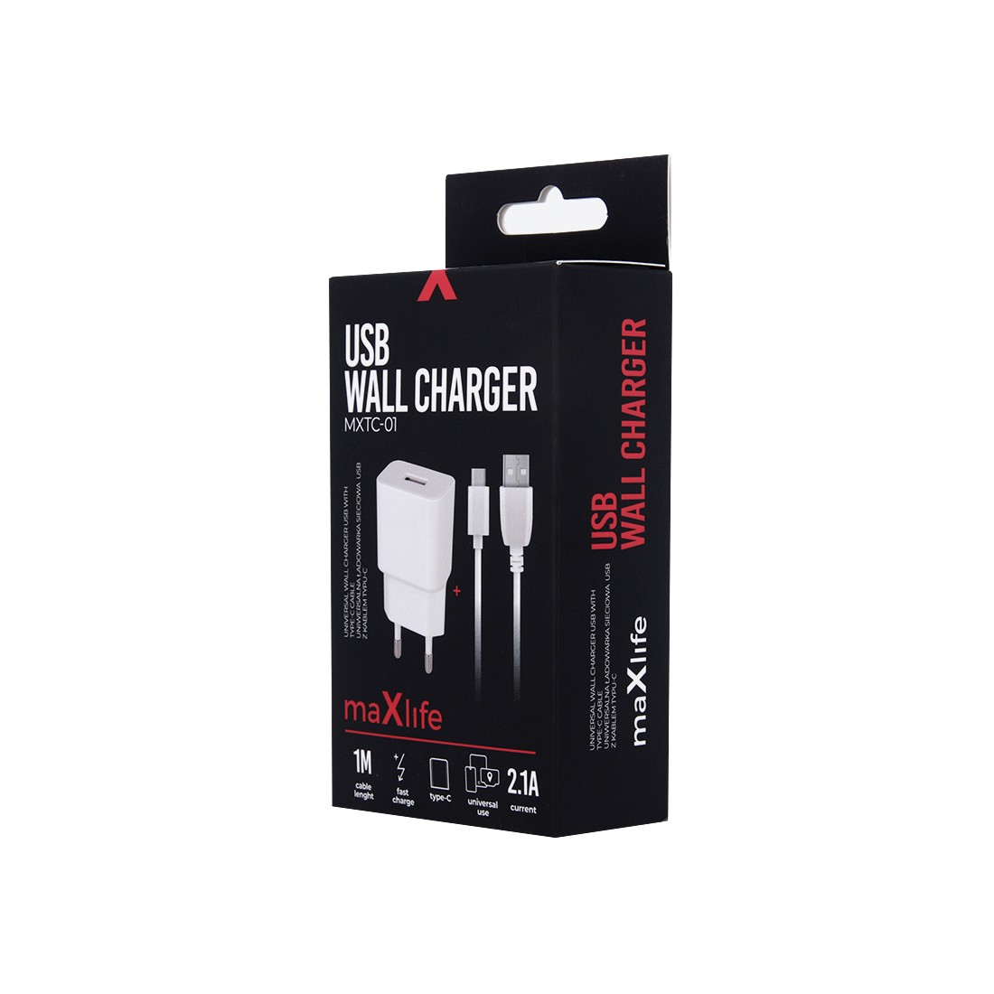 Caricabatterie USB da rete presa spina universale Maxlife + cavo TYPE-C 2.1A 5v Ricarica Rapida 1 metro Bianco