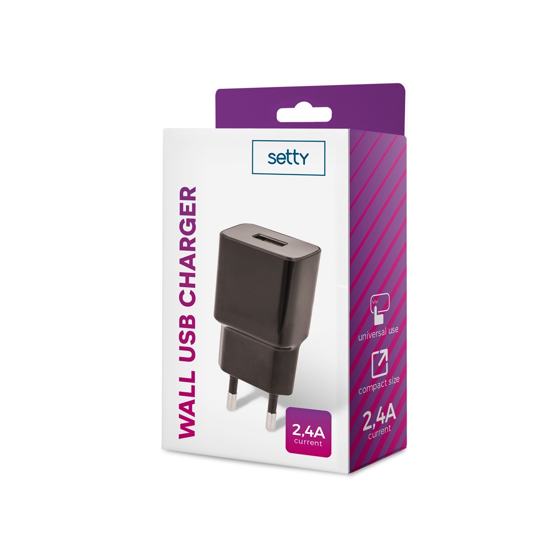 Presa Caricabatterie USB Spina senza Cavo Universale 2.4A 2A Setty Nera