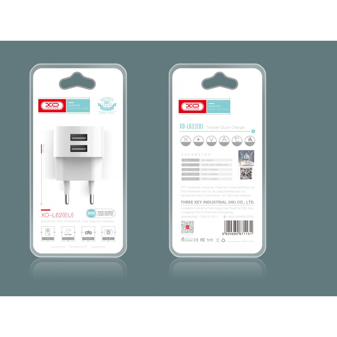 Caricabatterie da rete universale presa spina XO L62 DOPPIA Uscita USB 2,4A 5v Ricarica Rapida