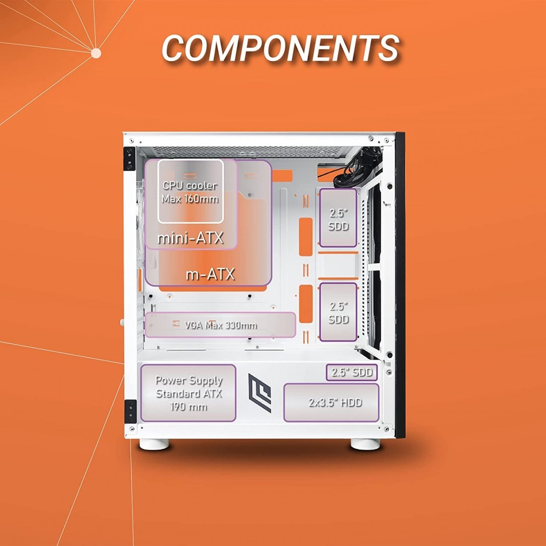 Il Case è di compatte dimensioni e può ospitare Dissipatori ad Aria fino a 160 mm e Schede Video con una lunghezza massima di 330 mm, è previsto un cover in metallo per coprire l’alimentatore e avere una gestione dei cavi più pulita. Sui pannelli superiore ed inferiore del case sono presenti filtri anti-polvere, quello superiore magnetico.