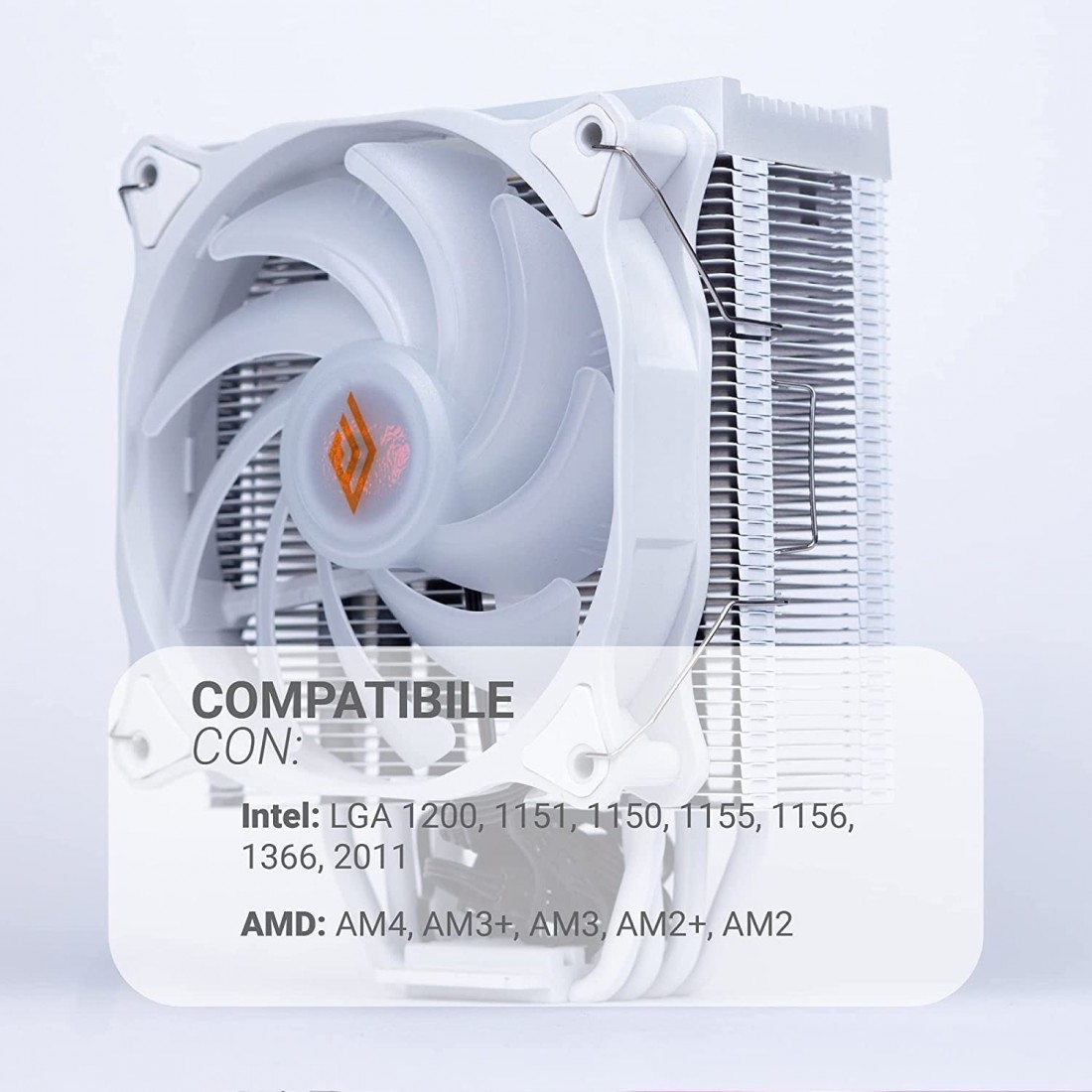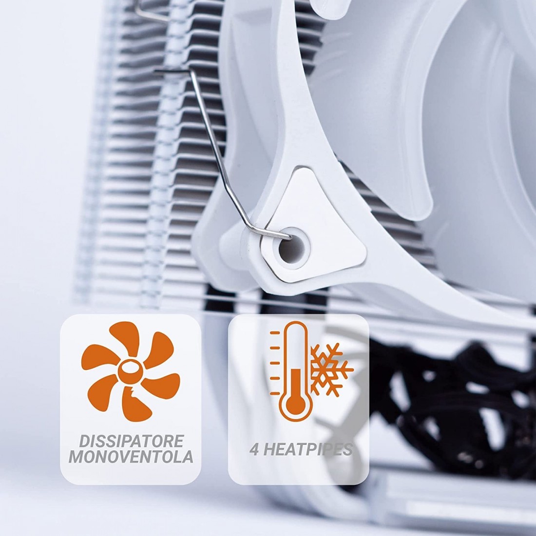 Noua Numb, dissipatore ad aria per CPU di nuova generazione, dotato di ventola PWM da 120 mm addressable 5V per un comodo controllo automatico della velocita tramite la scheda madre (800~1600 rpm), sorprendente effetto luce, design a quattro tubi di calore a contatto diretto per un ottima conducibilita termica.